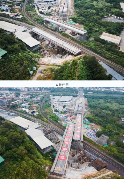 當(dāng)天7時(shí)04分,轉(zhuǎn)體橋梁開(kāi)始轉(zhuǎn)體,經(jīng)過(guò)44分鐘施工,成功完成高空“二人轉(zhuǎn)”,為下一步順利實(shí)現(xiàn)通車運(yùn)營(yíng)奠定堅(jiān)實(shí)基礎(chǔ)。轉(zhuǎn)體橋上跨既有漳龍線、龍東線及煤場(chǎng)專用線3條鐵路貨運(yùn)營(yíng)業(yè)線,距離營(yíng)業(yè)線最近距離僅5.9米,施工難度大,危險(xiǎn)系數(shù)高。